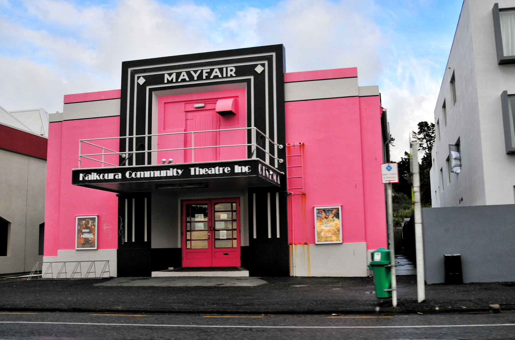 Un theatre a Kaikōura. La Nuova Zelanda viene spesso presa in giro per la sua somiglianza all'Inghilterra del tempo che fu, ma in questo caso questo "teatro" sembra essere una cosa all'americana, nel senso che è (anche) un cinema. L'estetica art deco è sempre presente, in NZ.