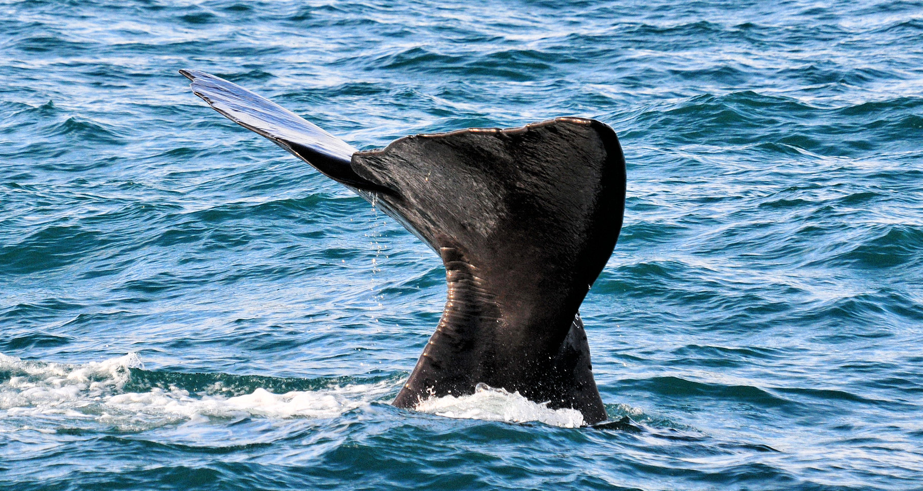 Non abbiamo purtroppo osservato il breaching, un comportamento comune tra i mammiferi marini (squali compresi), che a volte si lanciano fuori dall'acqua, in aria, con la testa in avanti, per poi ricadere in acqua con un tuffo. Per cui ecco invece un'altra coda di capodoglio.