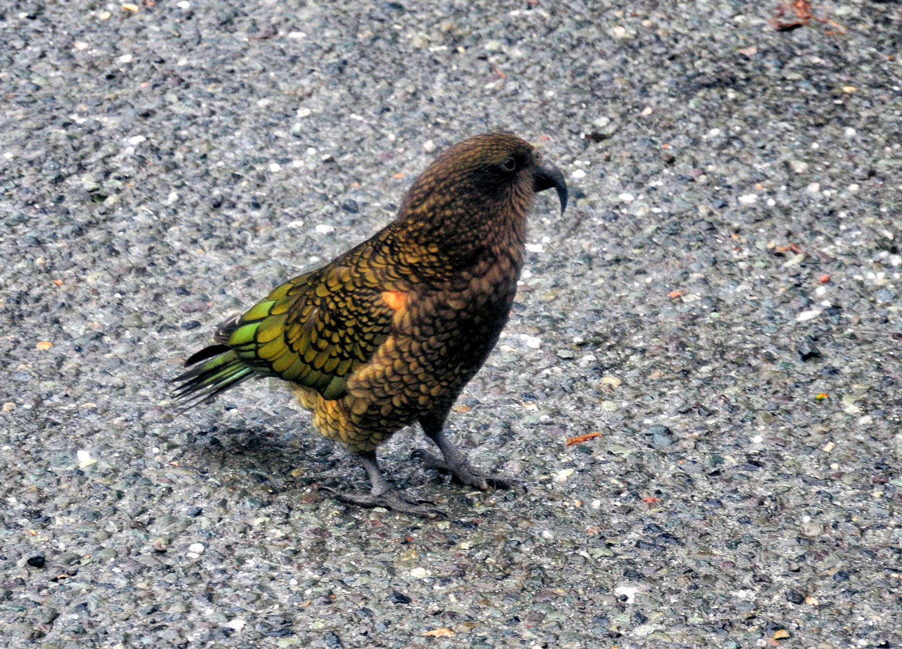 Un kea (Nestor notabilis), tipico pappagallo selvatico della zona alpina neozelandese.