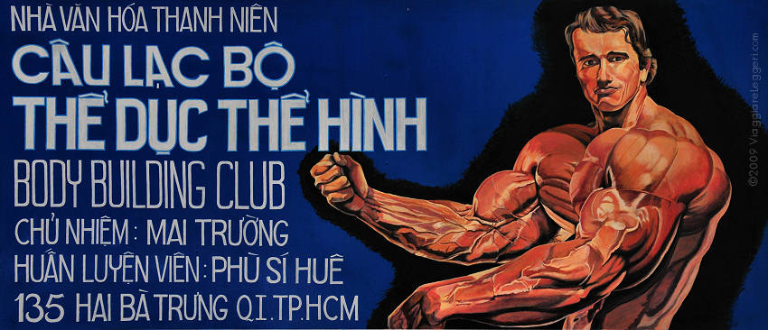 Pubblicità di un centro per body building a Saigon (Ho Chi Minh City), in Vietnam. Dubito che Arnold Schwarzenegger sia stato pagato per quest'immagine... e non credo abbiano preso in considerazione Sylvester "Rambo" Stallone, come volto di questo pittoresco cartello pubblicitario...