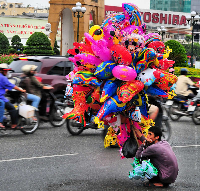 Fotografato di fronte al Ben Thanh Market. Il ragazzo stava accovacciato, incurante delle auto e degli scooter che passavano a pochi centimetri, davanti e dietro. Di sicuro era ben visibile, anche da lontano, grazie ai palloncini, ma mi chiedo quanti motociclisti abbiano anche solo pensato di fermarsi nel traffico per comprare un palloncino, sapendo che sarebbero stati tamponati da qualcuno.