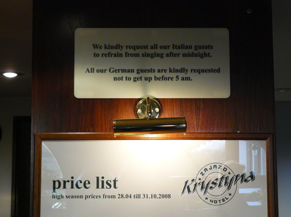 04/12/2009 | Claudio_VL | 0 commentiIl Times ha pubblicato una serie di foto di cartelli bizzarri visti in giro per il mondo dai suoi lettori. Una delle foto, scattata in un albergo in Polonia, riguarda abitudini nazionali italiane e tedesche: