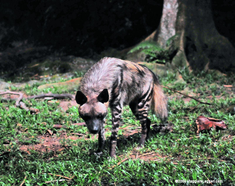 Infine, il fattore Grande Fratello. No, non quello originale di George Orwell: la boiata televisiva, invece. Visitare questo safari, di notte, con alcuni animali - una tigre e la iena visibile nella fotografia, tra gli altri - visibilmente irrequieti, e' un po' come sbirciare quel che le persone normali (io che scrivo e tu che leggi) fanno quando rientrano a casa e sono libere - o credono di esserlo - di fare quel che vogliono, nella privacy della loro casa. Come gli ospiti - volontari, pero', quelli - del Grande Fratello, anche gli animali del safari notturno sembrano subire le visite. E' una sensazione che avviene in ogni zoo e ovunque vi siano inferriate, barriere e gabbie, ma qui ... e' notte, cavolo, e leoni e tigri e leopardi e gattoni vari mi pare siano predatori diurni, non notturni. Va bene che non hanno bisogno di andare a caccia, ma fargli fare il turno di notte, anche se solo dalle 19 alle 24, mi pare un po' contro natura.