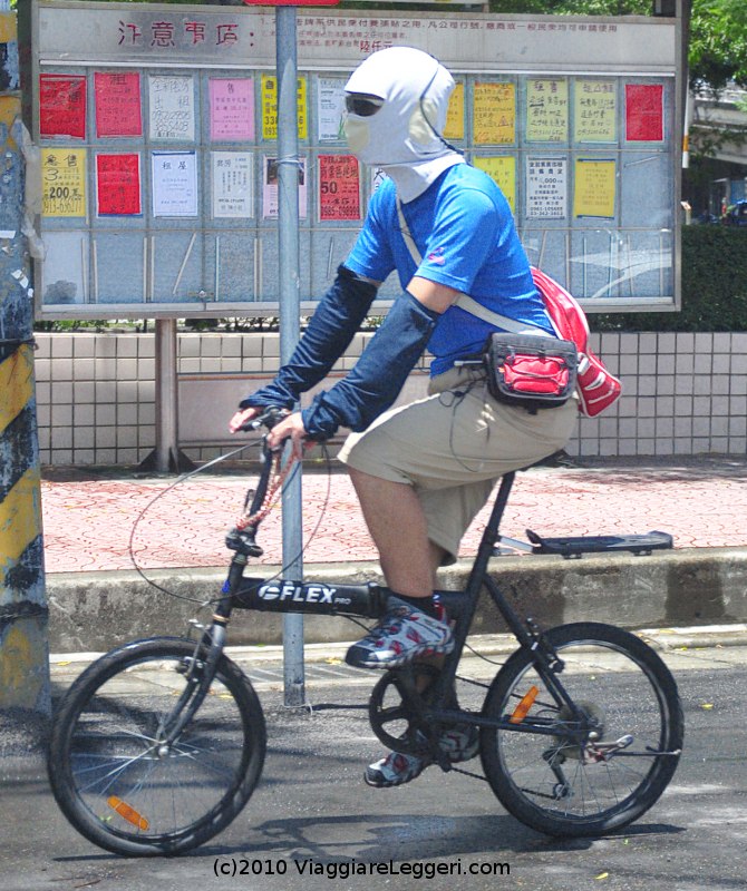 Un ciclista a Taoyuan (Taiwan) si protegge dal sole e dall'inquinamento come puo'. Temperatura al momento in cui la foto e' stata scattata: circa 35 gradi.
