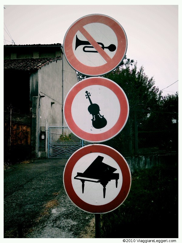 Ritorna il quiz della settimana: in quale comune italiano e' stata scattata questa foto, che mostra una spiritosa serie di cartelli stradali a tema musicale?