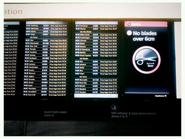 Visto a Heathrow, T5. Sto ancora cercando di scoprire la misteriosa destinazione del mio viaggio di compleanno. Sono le 11 e 20 di venerdi' sera.