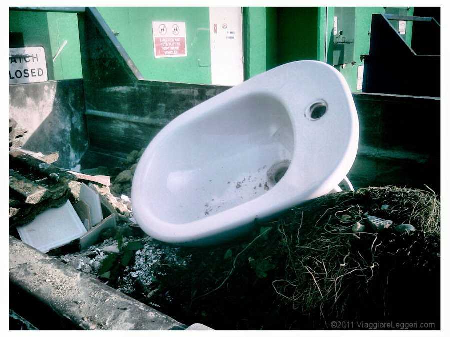 24/09/2011 | Claudio_VL | 1 commentiBidet visto nella discarica del distretto di Spelthorne in Inghilterra. Vi pare solo un pezzo di ceramica? In realta' e' un'affermazione di indipendenza culturale: qualcuno ha acquistato una casa, il proprietario precedente sara' stato italiano o francese e avra' fatto installare anche il bidet, e il nuovo proprietario l'ha visto, ha pensato "non mi serve la vasca da bagno per il violino!", e l'ha buttato.