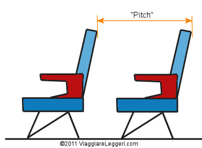 Nella classe economica, Lufthansa ha avvicinato i suoi sedili, che erano a 32 pollici (81,28cm) e ora sono a 30 pollici (76,2 cm) l'uno dall'altro. La distanza viene definita "pitch" ed e' misurata dal retro di uno schienale al retro del successivo schienale (vedi illustrazione). Lufthansa ha avvicinato i sedili di cinque centimetri, ma paradossalmente lo spazio a disposizione - soprattutto nella zona delle ginocchia - e' aumentato grazie ad alcuni accorgimenti. Primo, i nuovi sedili sono ultrasottili: la spessa imbottitura utilizzata in passato e' stata sostituita da materiali simili a quelli delle sedie da ufficio, ed anche la struttura rigida dei sedili e' stata razionalizzata per ridurne lo spessore. Secondo, la tasca porta-riviste e' stata spostata piu' in alto, in modo da non interferire con le ginocchia, e questo e' il tocco di buon senso: se sono le ginocchia a sbattere contro il sedile davanti a noi, perche' complicare ulteriormente la vita dei passeggeri mettendo davanti alle loro rotule la tasca per le riviste? Spero che altre linee aeree applichino perlomeno questa modifica.