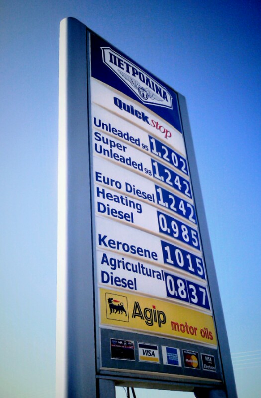 Prezzi rilevati in una stazione di servizio Petrolina ad ovest di Nicosia ("Lefkosia"), la capitale di Cipro.