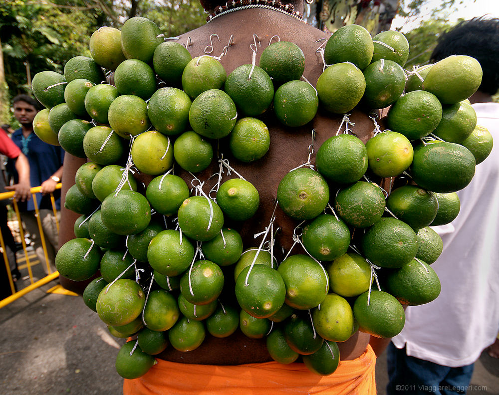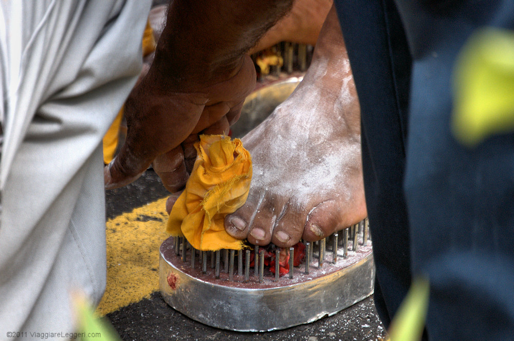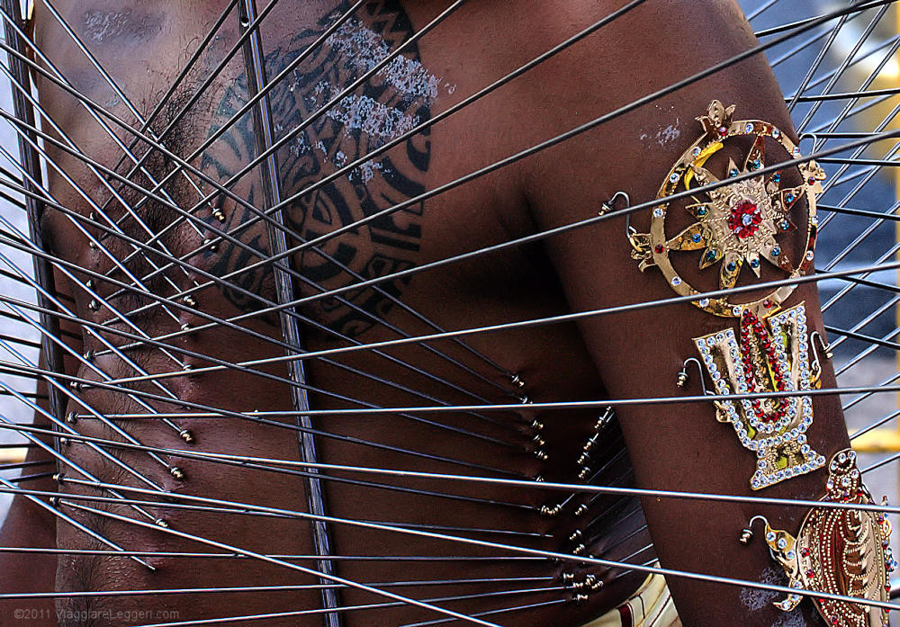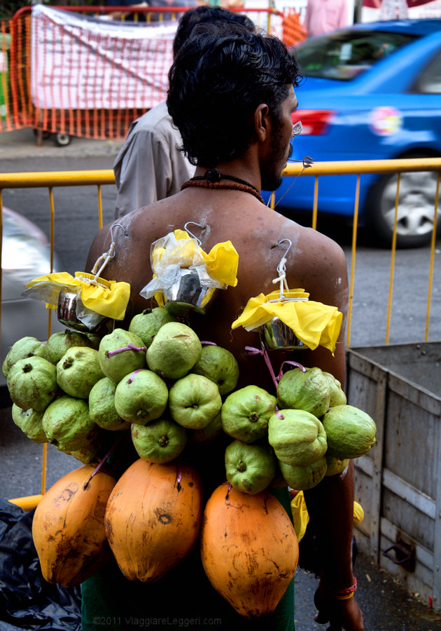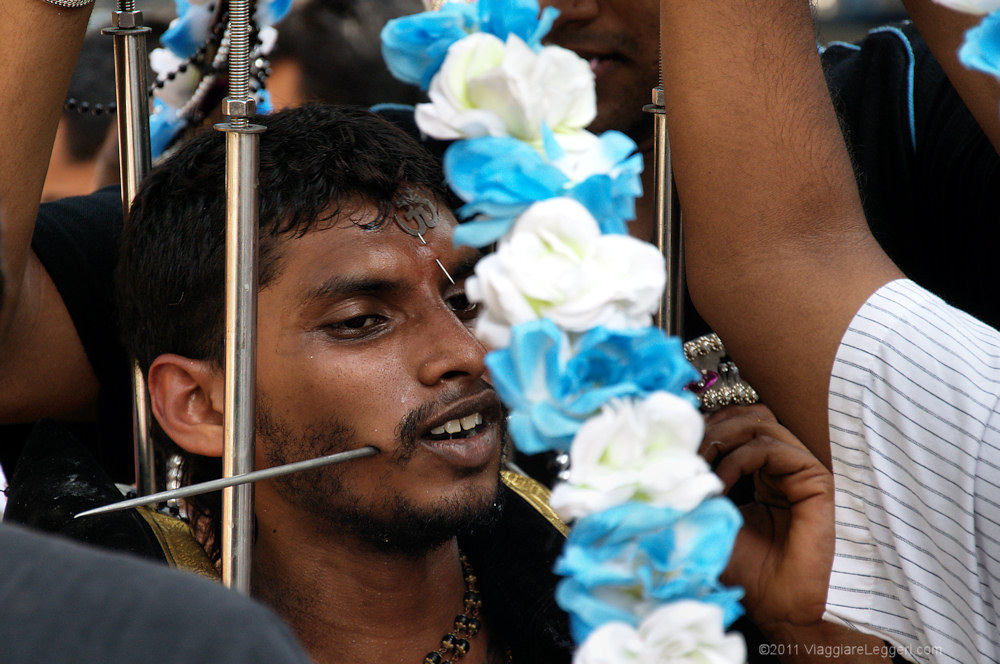 Molti fedeli partecipano alla processione portando i kavadis, ampi telai metallici. I kavadis vengono attaccati tramite ganci direttamente alla pelle dei fedeli. Come in ogni processione religiosa, l'elemento del sacrificio e' presente anche a Thaipusam: oltre ai telai metallici, altri fedeli utilizzano uncini per attaccare alla pelle frutti che tirano la pelle, e a volte la lacerano. Altri ancora partecipano alla processione con lunghi chiodi infilati nella carne delle guance, altri hanno appese alla schiena delle scodelline con offerte votive.