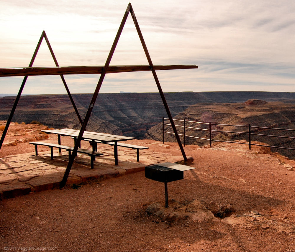 Il Goosenecks State Park e' un parco a poca distanza dal villaggio di Mexican Hat, nello Utah. Il nome del parco, e l'attrazione principale dello stesso, deriva dal tortuoso percorso del fiume San Juan, che scorre in fondo ad un canyon. L'ingresso nel parco e' gratuito, non sono presenti strutture come ristoranti o alberghi (solo un paio di bagni pubblici), ed e' consentito il campeggio. Ma in novembre fa piuttosto freddo...