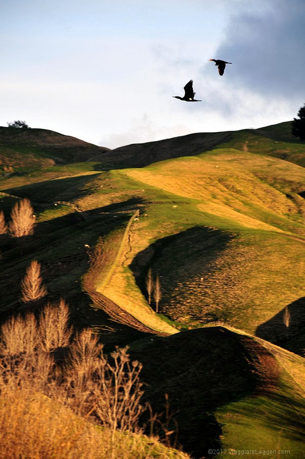 Uccelli in volo nell'entroterra di Napier, in Nuova Zelanda. Ultima foto di questo breve ciclo che potremmo chiamare "fare troppe foto e' come non farne", o "le foto della Nuova Zelanda che persi e che poi ritrovai". Durante il mese di luglio, in pieno inverno australe, la luce in Nuova Zelanda e' sempre simile a quella del tramonto, bassa e capace di esaltare il profilo di ogni albero e di ogni collina.