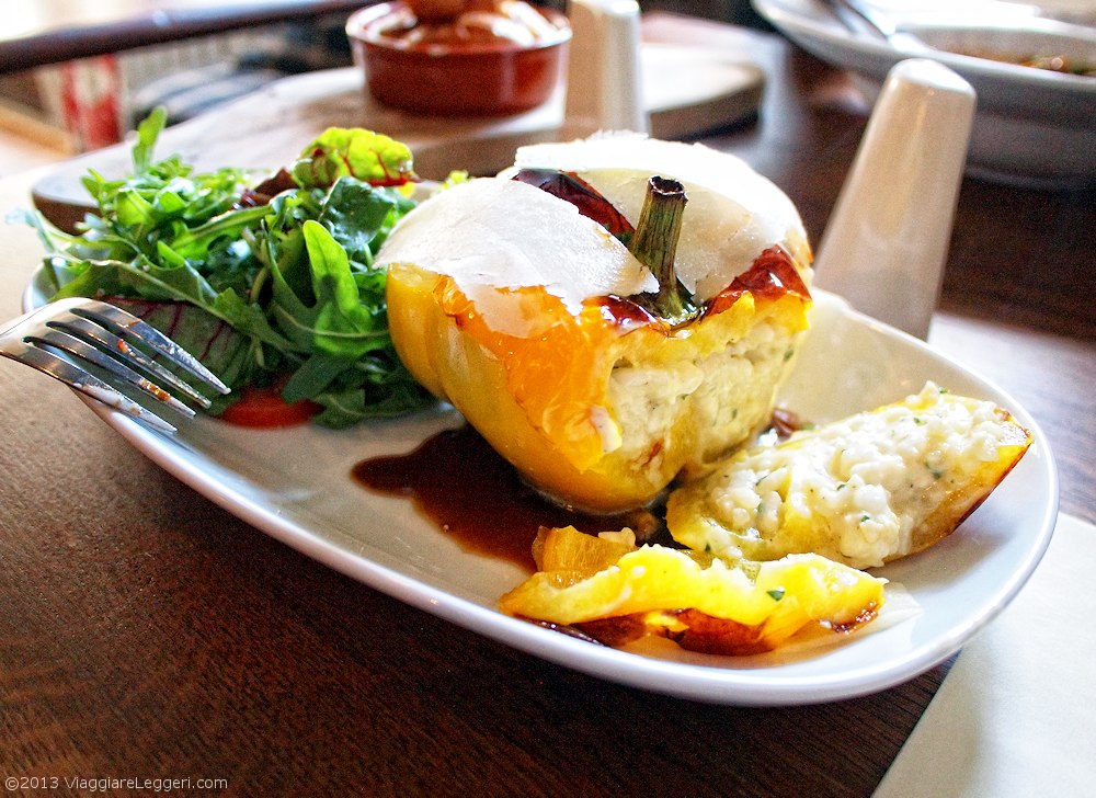 07/05/2013 | Claudio_VL | 0 commentiIl pranzo della domenica: peperone cotto farcito di formaggio Llangollen gallese, affumicato, servito con glassa balsamica. Pub Bear Inn a Cirencester, nei Cotswolds. Buono.