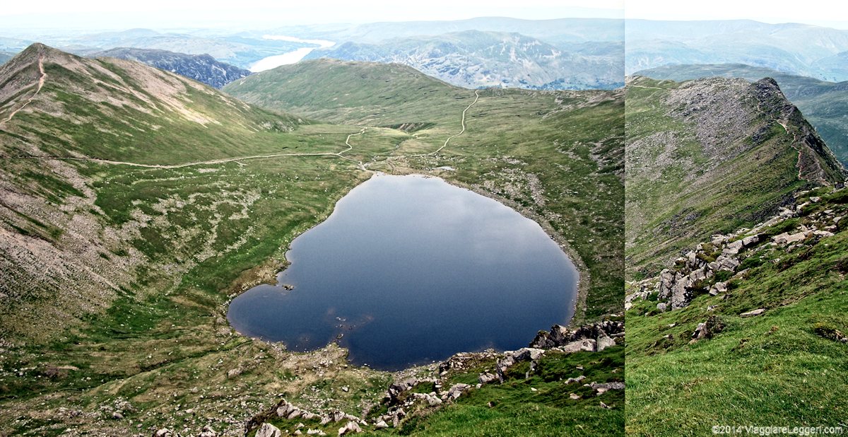 Red Tarn (il lago), con Swirral Edge (la cresta sulla sinistra) e Catstye Cam (il picco al termine della cresta). Sarebbe bello campeggiare vicino al lago, ma qui piove spesso, e questa valle mi pare il fondo di una bacinella, ideale per convogliare acqua nel lago. Non il posto ideale per piazzare una tenda.