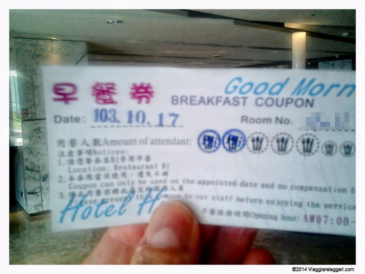 La foto mostra il coupon per la colazione in un albergo a Taiwan, ed e' datata diciassette ottobre dell'anno centotre.