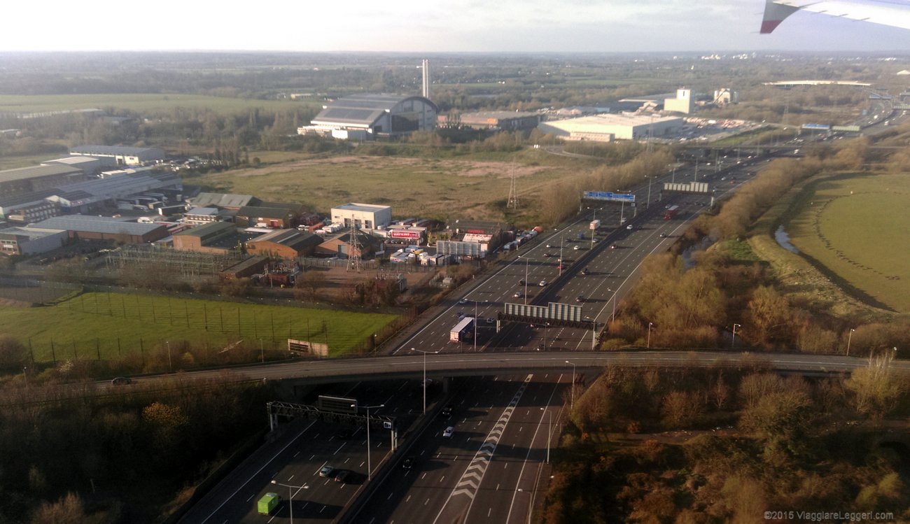 La M25, la tangenziale di Londra e, sopra, Bath Road, che proseguendo verso est (destra), porta verso l'angolo nord-occidentale dell'aeroporto di Heathrow, poco piu' a nord del Terminale 5.