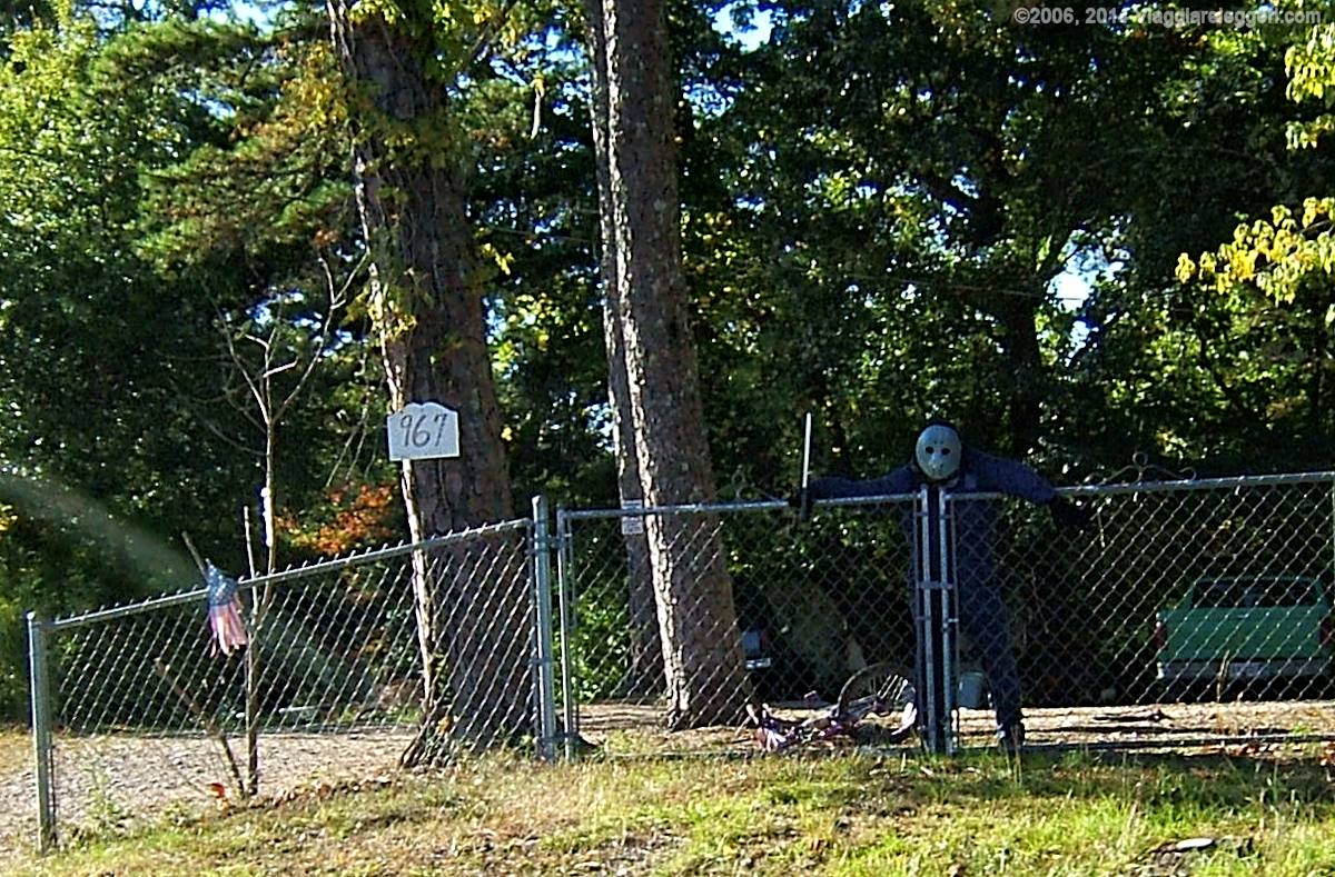 Aveva ragione lei. Al 967 di quella strada di collina c'era Jason Voorhees, il cattivo della saga di Venerdì 13, quello con la maschera da portiere di hockey su ghiaccio. Appoggiato alla rete, difficile da notare all'ombra degli alberi, Jason sembra di guardia, casomai qualche malintenzionato decidesse di cercare di entrare in casa.