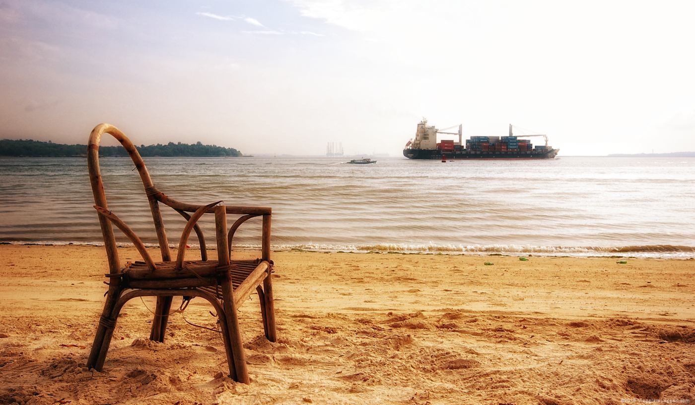 Mi piace questa sedia, piazzata su una spiaggia deserta sulla costa orientale di Singapore, vicino al parco di Pasir Ris. Mi ricordo la sabbia, morbida e umida ma non bagnata, ideale per una passeggiata a piedi nudi. Mi piace persino la nave portacontainer, e le ciminiere dello stabilimento industriale sullo sfondo.