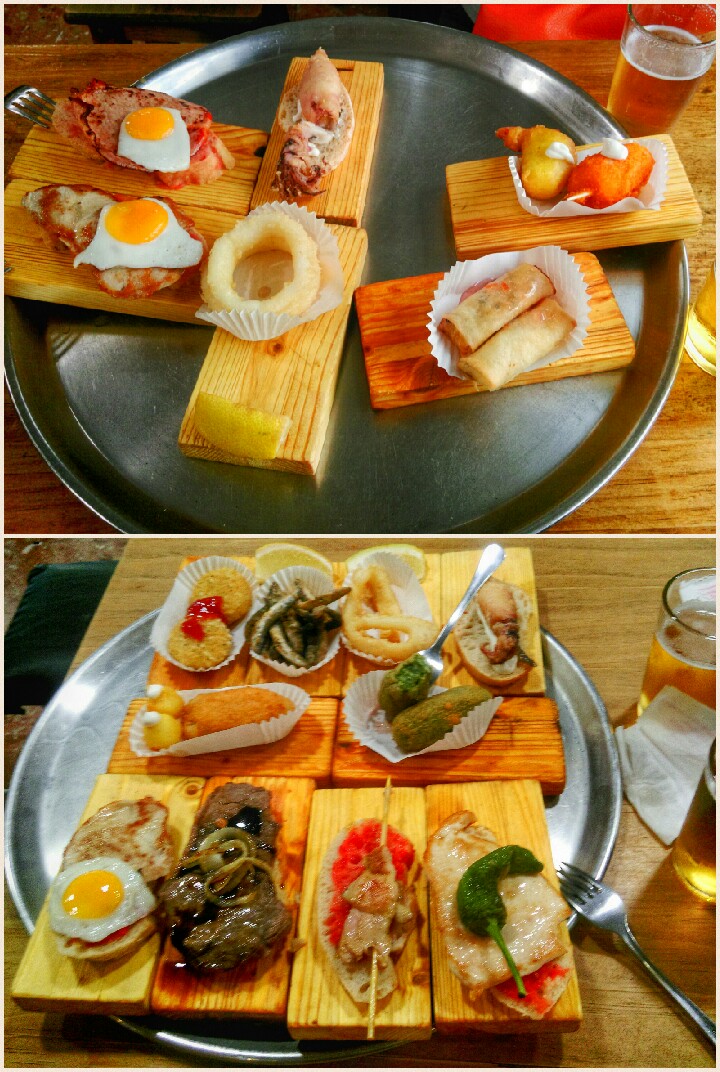 Ci sediamo ad uno dei piccoli tavoli in legno, e nonostante il ristorante/bar/taperia sia pieno, nel giro di un minuto arriva un cameriere a spiegarci come ordinare: loro passano con un vassoio contenente vari piatti (in realta' dei rettangoli in legno, vedi foto), tu prendi quelli che vuoi, e loro poi contano i piatti vuoti e ti fanno pagare di conseguenza.