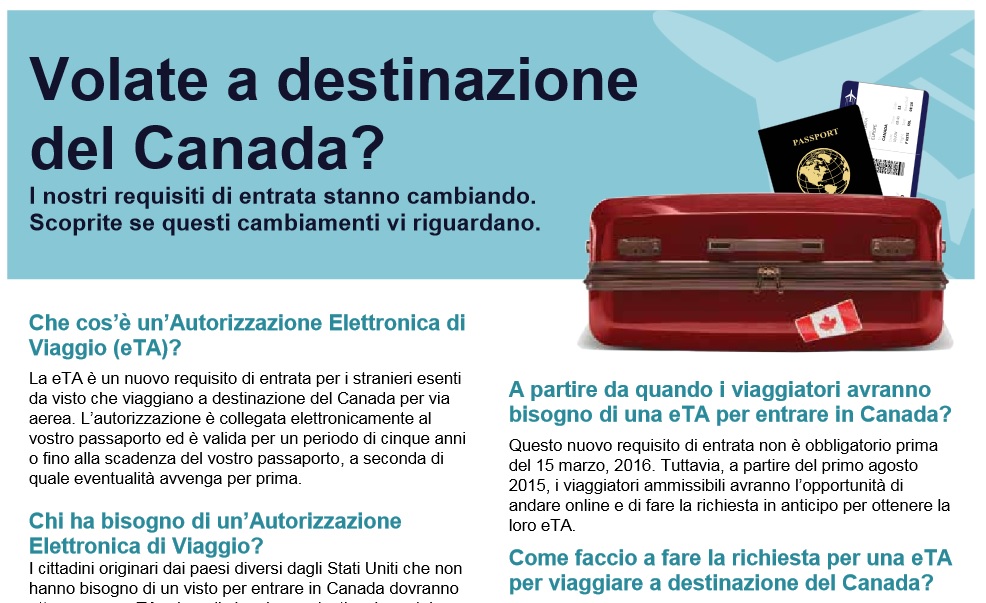 Vai in Canada? Se sei italiano non serve il visto, ma dal 15 marzo 2016 chi entra in Canada per via aerea avra' bisogno dell'eTA, l'Autorizzazione Elettronica di Viaggio. Si tratta di un documento che va richiesto online (qui). Per ottenere l'eTA (che e' valida per 5 anni) servono: