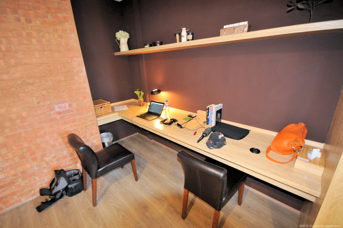 Il letto è molto comodo ed è anche molto ampio, queen size o king size: e' largo più o meno un metro e ottanta. La camera da letto in cui dormiamo noi, all'ultimo piano, e' dotata di un eccellente angolo ufficio... in realtà un ufficio quasi completo, come dimensioni: c'è una scrivania lunga 3 metri, tante prese elettriche sotto la scrivania. Francamente ci vivrei, in questa appartamento, se non fosse che il prezzo non è esattamente modico: per l'affitto di tutto l'edificio abbiamo speso 12.000 dollari taiwanesi equivalenti a 300 sterline, per un giorno e una notte.