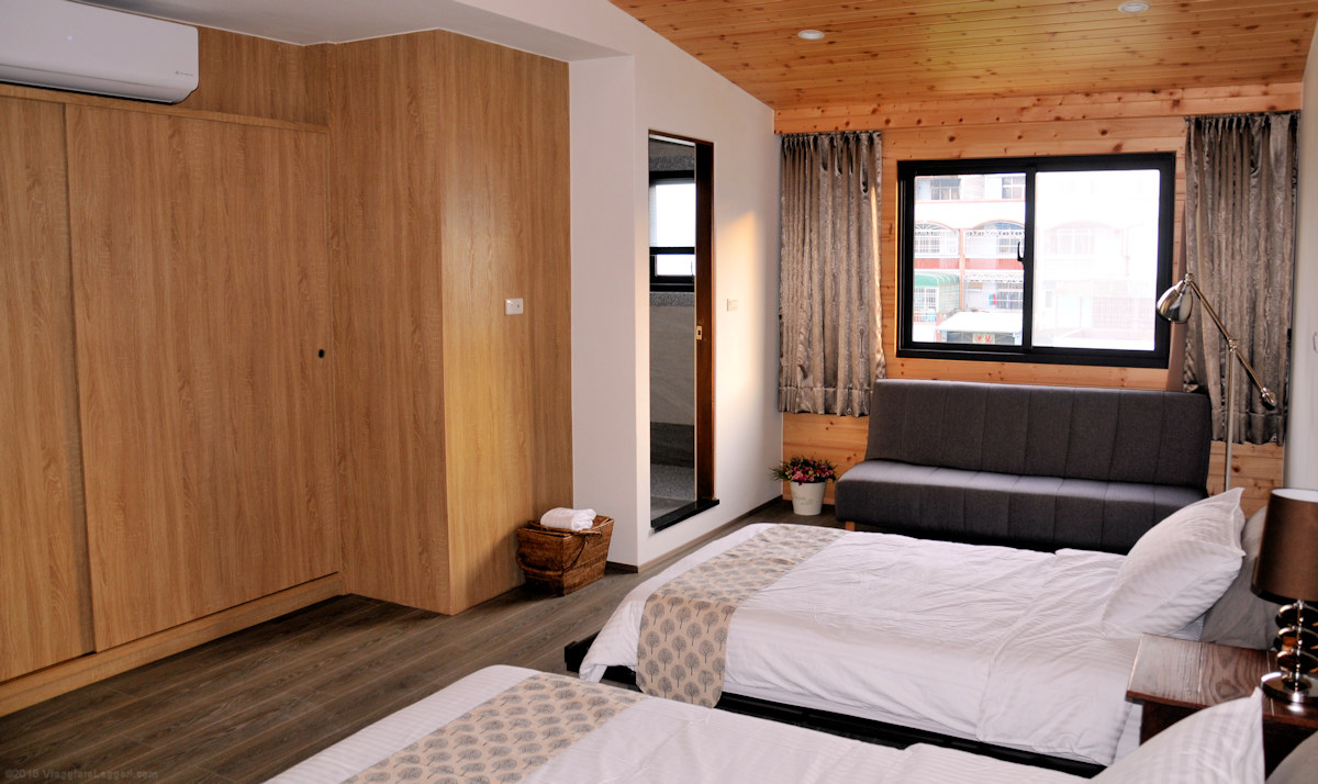 Jesse mi racconta la storia dell'edificio. Era la casa della sua famiglia, non hanno altri alberghi o case da affittare. A Taiwan la distinzione tra b&b, self catering, case in affitto e "alberghi" è una zona grigia, non è netta come piacerebbe a me. Con Jesse parliamo in inglese e a volte anche in tedesco, visto che ha lavorato in Germania e le piace parlare tedesco, come a me. Mi spiega che la casa che abbiamo affittato è un "lavoro d'amore" creato da lei e da suo fratello. Era la casa in cui hanno vissuto generazioni della loro famiglia, poi si sono trasferiti altrove, infine l'hanno ricomprata e ridecorata da zero, con una cura maniacale - direi "italiana" nel senso migliore dei della parola - dei dettagli. Tutti gli spigoli sono protetti con para-spigoli piccoli ed efficaci. Niente striscia, tutto si apre e chiude con click teutonici, in modo netto e preciso. Ad essere pessimista mi viene da pensare che sia un business model, ed una qualità estetica, difficilmente sostenibile a lungo termine: il posto e' probabilmente stato completato di recente, viene probabilmente ripulito in modo meticoloso dopo ogni cliente, e ... no, non mi interessa essere pessimista: il posto pare perfetto, qui, ora che ci sono dentro. Tanto basta, tanto dovrebbe bastare a chiunque.