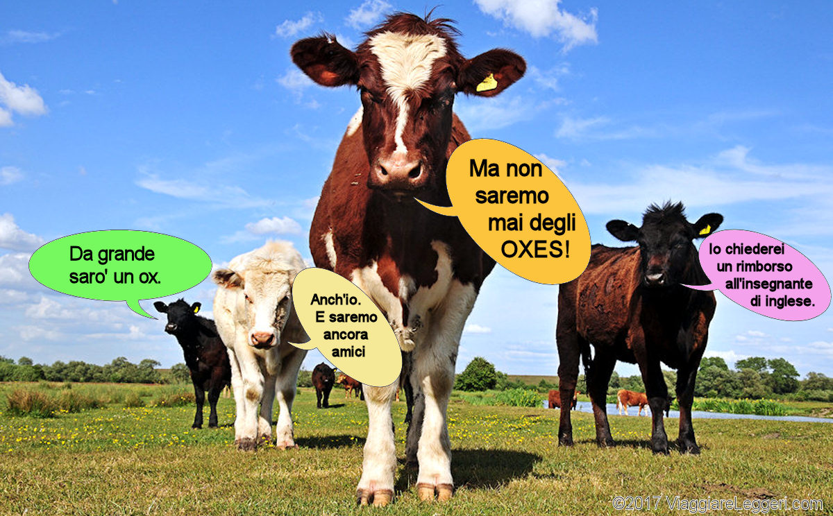 La guida, sapendo che "bue" si traduce "ox", ha immaginato (o ha letto sulla documentazione che le è stata fornita) che il plurale fosse "oxes". Purtroppo per lei, "ox" ha un plurale irregolare, come child/children: la parola corretta è oxen, non oxes. E qualcuno farà bene a dirglielo, per evitarle figure barbine coi turisti stranieri (ma niente paura: siamo lontani dalle inarrivabili "whispers" di una guida turistica fiorentina).
