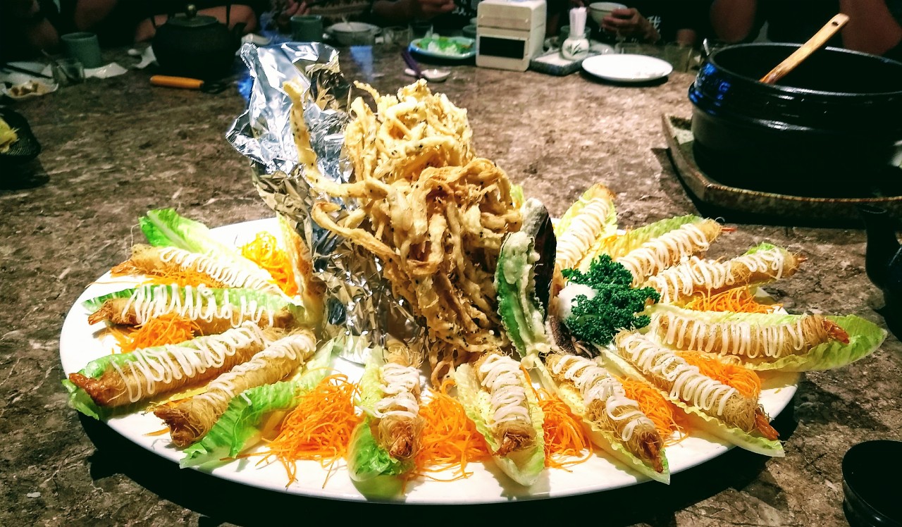 (↑) Verdure fritte al centro, scampi su lattuga intorno.