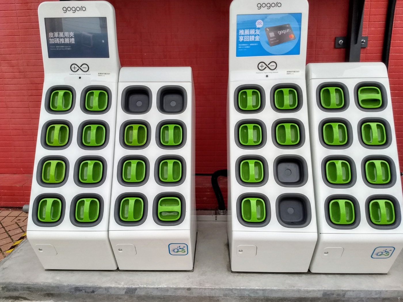 Si tratta di un punto di ricarica Gogoro, in cui ci si ferma, si sostituisce l'intera batteria dello scooter con una già carica, e si riparte, riducendo al minimo i tempi morti. Le batterie (quei cosi verdi con maniglia nella foto) si rimuovono ed installano apparentemente in fretta e senza fatica, il che e' più pratico che ricaricare una batteria fissa.