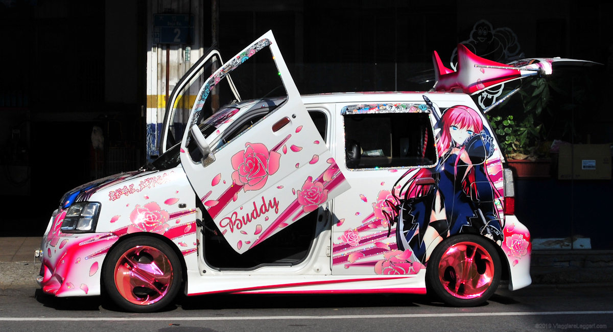 09/02/2019 | Claudio_VL | 0 commentiA Taiwan a volte si vedono auto decorate in modo vistoso. Molto vistoso. Vicino a Hualien ne fotografai una con Stitch (quello di Lilo e Stitch) e una con la Grande Onda di Kanagawa (con aggiunta di un mostro marino). Questa, invece, e' una piccola due volumi con colori e disegni molto femminili, che addolciscono molto la linea squadrata della vettura. Peculiari anche i cerchi delle ruote. Se poi il personaggio sia stato preso a prestito da un manga, da un anime o se sia stato creato ex novo, non saprei dirlo.