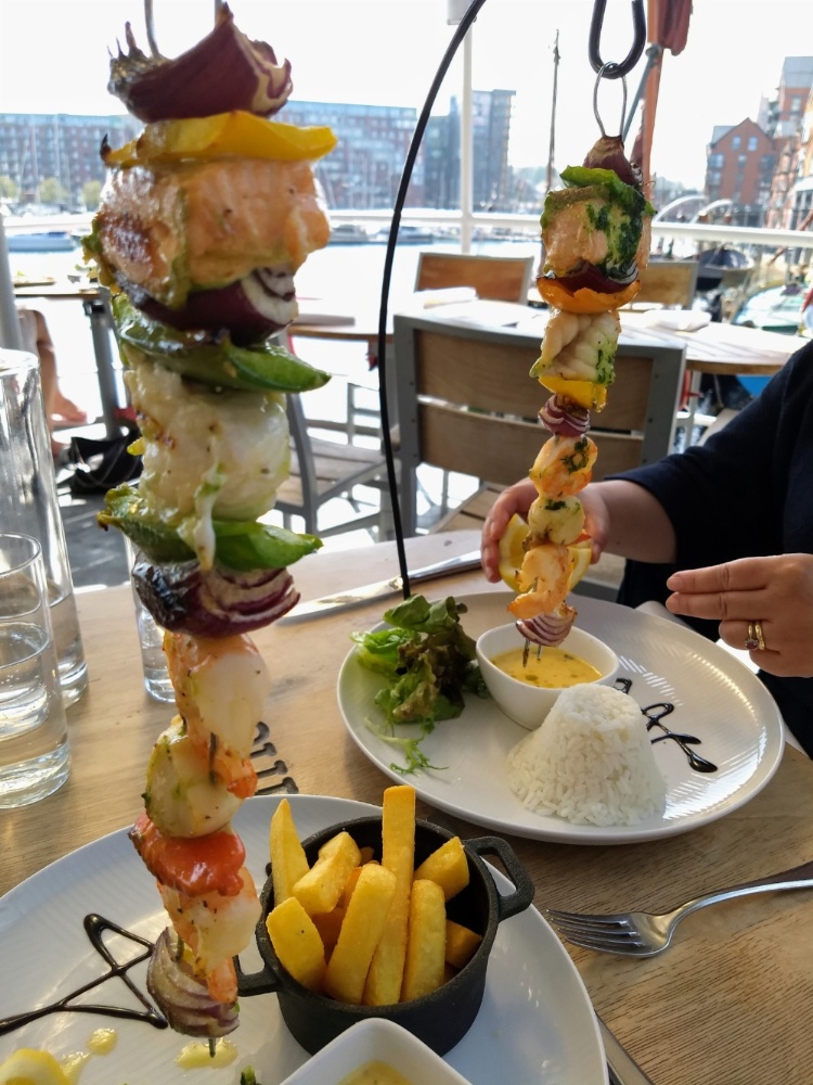 A Ipswich, la capitale del Suffolk, abbiamo mangiato in un ristorante con vista sul porto turistico. Mangiato bene, il piatto principale sono stati questi spiedini di mare.