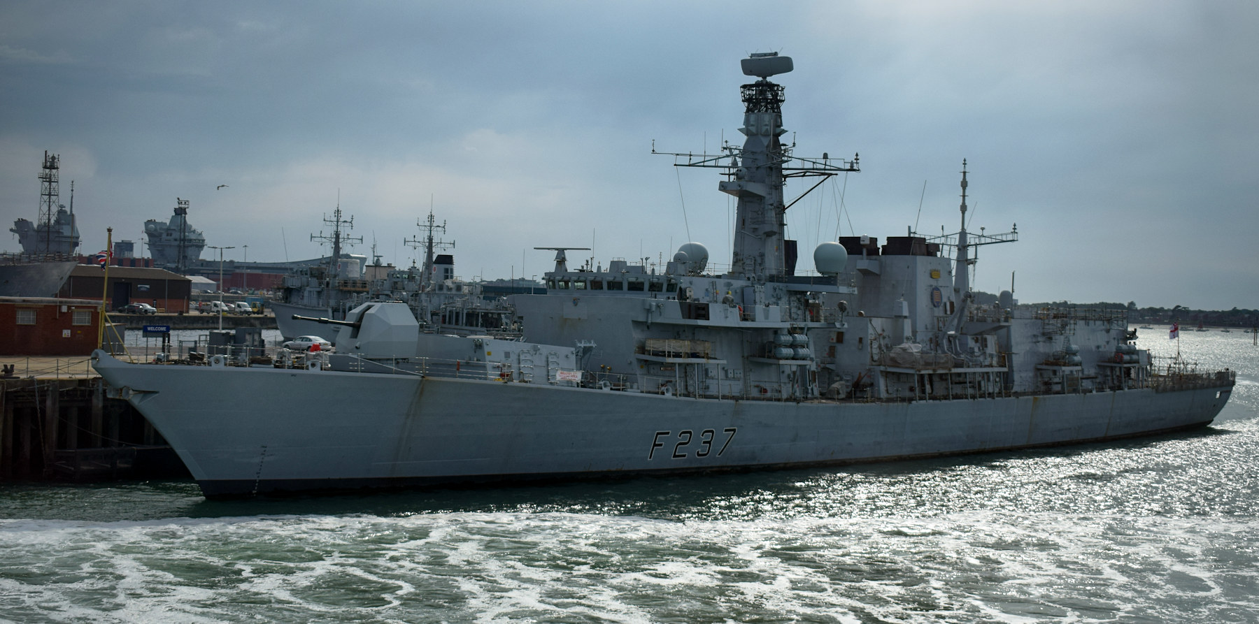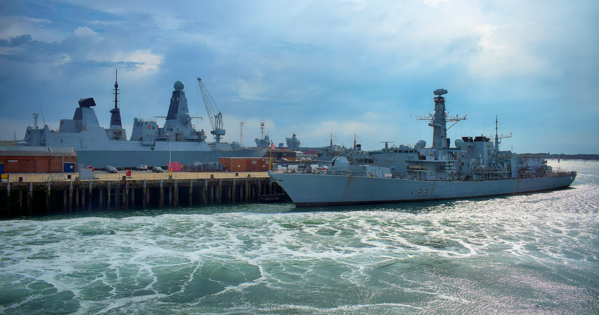 Foto di gruppo per la Royal Navy. In primo piano la fregata HMS Westminster (F237). Dietro il cacciatorpediniere HMS Duncan (D37). Sullo sfondo, tra le due navi, si intravede il ponte inclinato di una portaerei; la Royal Navy ne ha due, Prince of Wales e Queen Elizabeth, non e' possibile identificare correttamente la nave in questa foto.