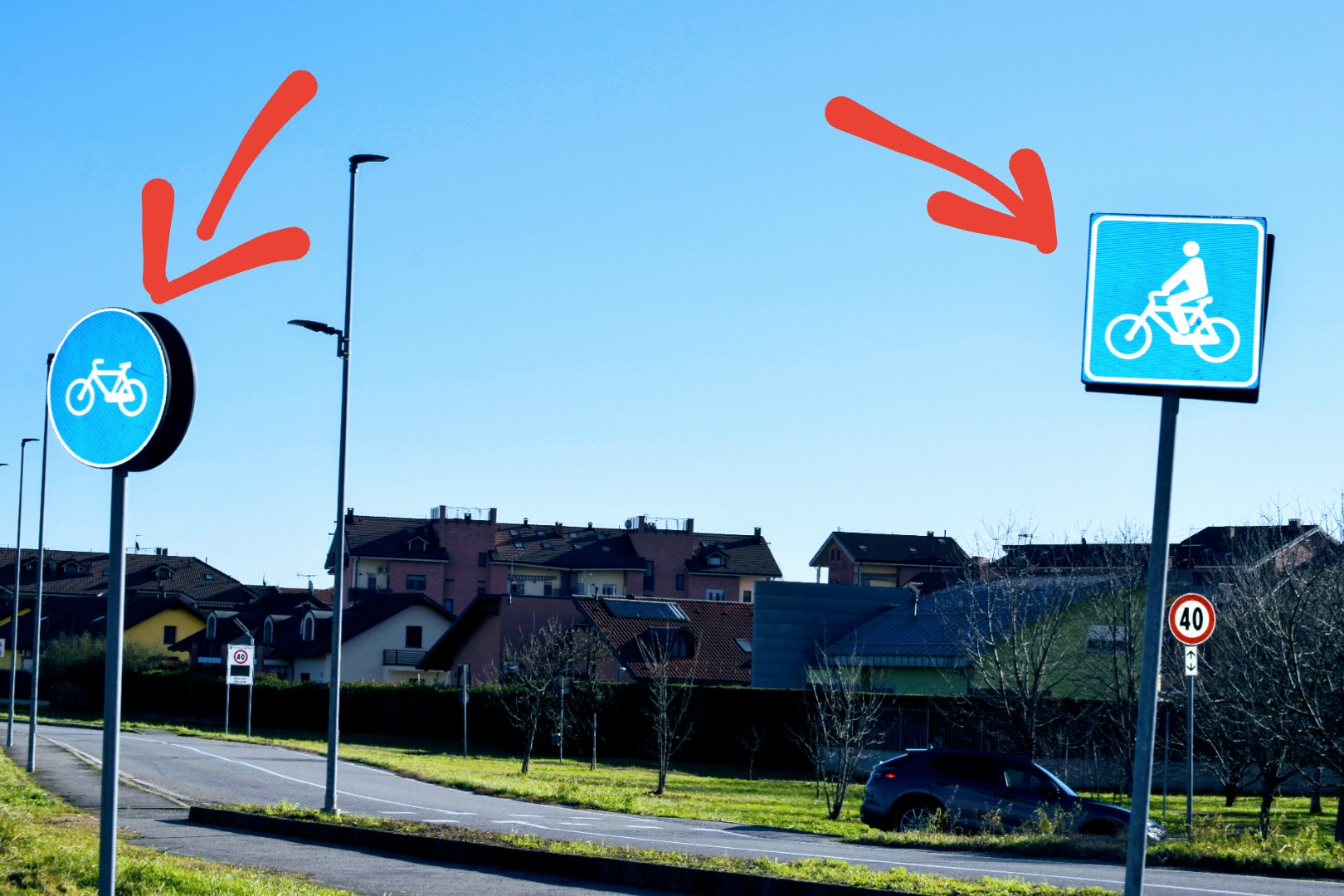 Ecco due cartelli lungo una pista ciclabile cittadina. Per me, italiano espatriato, se ci sono due cartelli differenti ci saranno due significati differenti: uno vorrà dire "pista ciclabile utilizzabile da ciclisti", l'altro probabilmente vorrà dire che le bici devono procedere senza ciclista. O forse, in modo più ragionevole, che è vietato pedalare e la bici va accompagnata a mano.