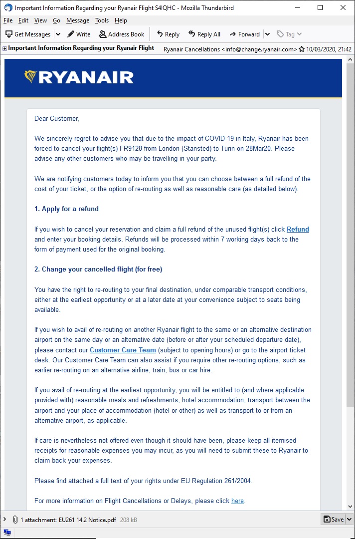 11/03/2020 | Claudio_VL | 11 commentiIeri notte ho ricevuto un'email della Ryanair: il mio volo Londra-Torino per fine marzo e' stato cancellato. Cercherò di documentare l'avanzamento della procedura di rimborso, sperando sia breve. Continuate a visitare questa pagina nei prossimi giorni, fino alla conclusione della procedura.