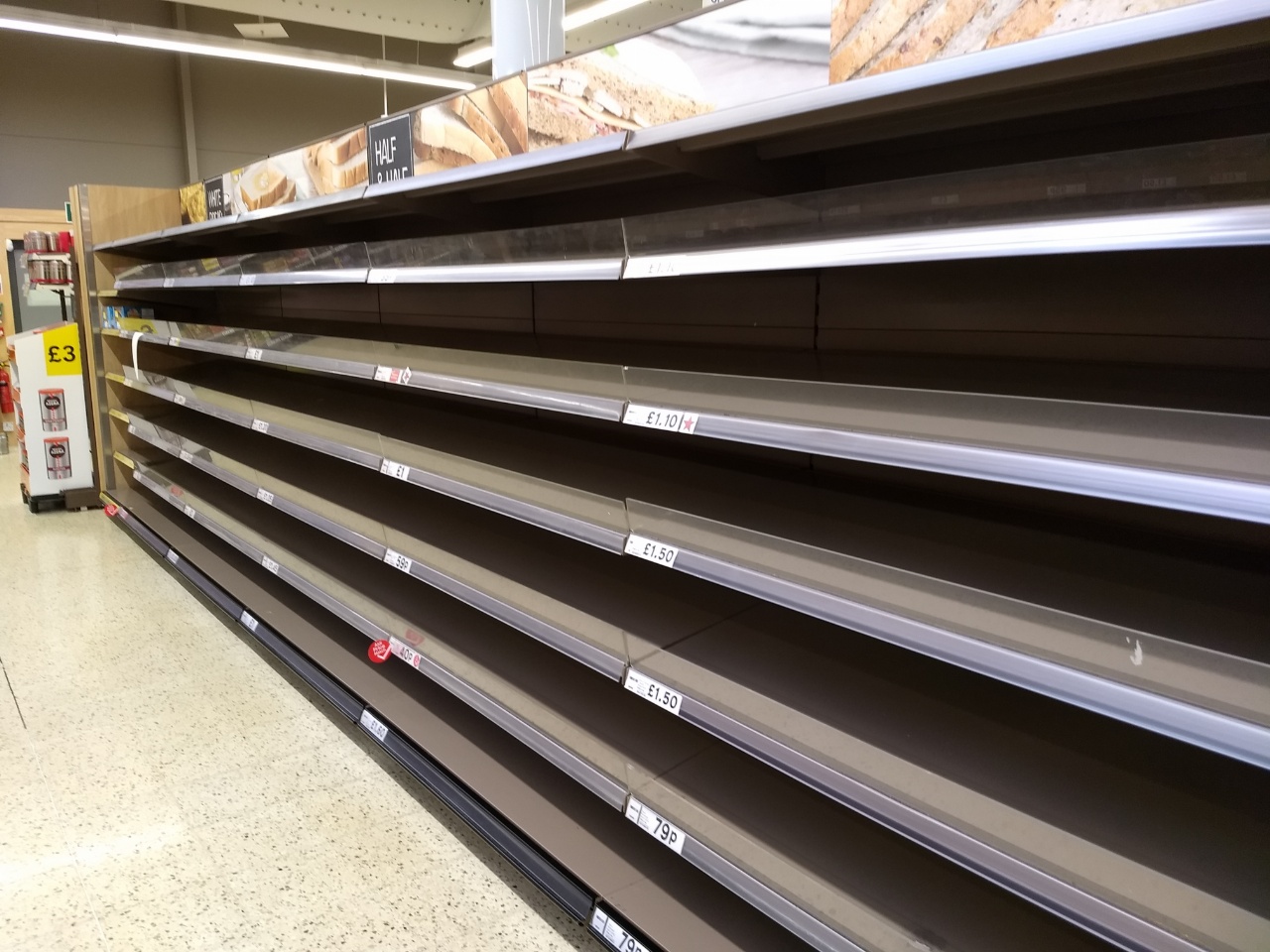 Prima di andare in ufficio faccio un giro sia da Tesco che da Waitrose.Non ci sono uova, niente latte UHT, niente carta igienica, zero pasta. Il sugo invece non e’ esaurito, forse fanno tutti la pasta in bianco, oppure non ci hanno pensato. Potrebbe essere l’occasione buona per vedere gli inglesi cucinare pasta che non annega nel sugo… Alla fine compro solo due confezioni di caffè Lavazza decaffeinato da Waitrose, 250 grammi e 4,15 sterline ciascuna.