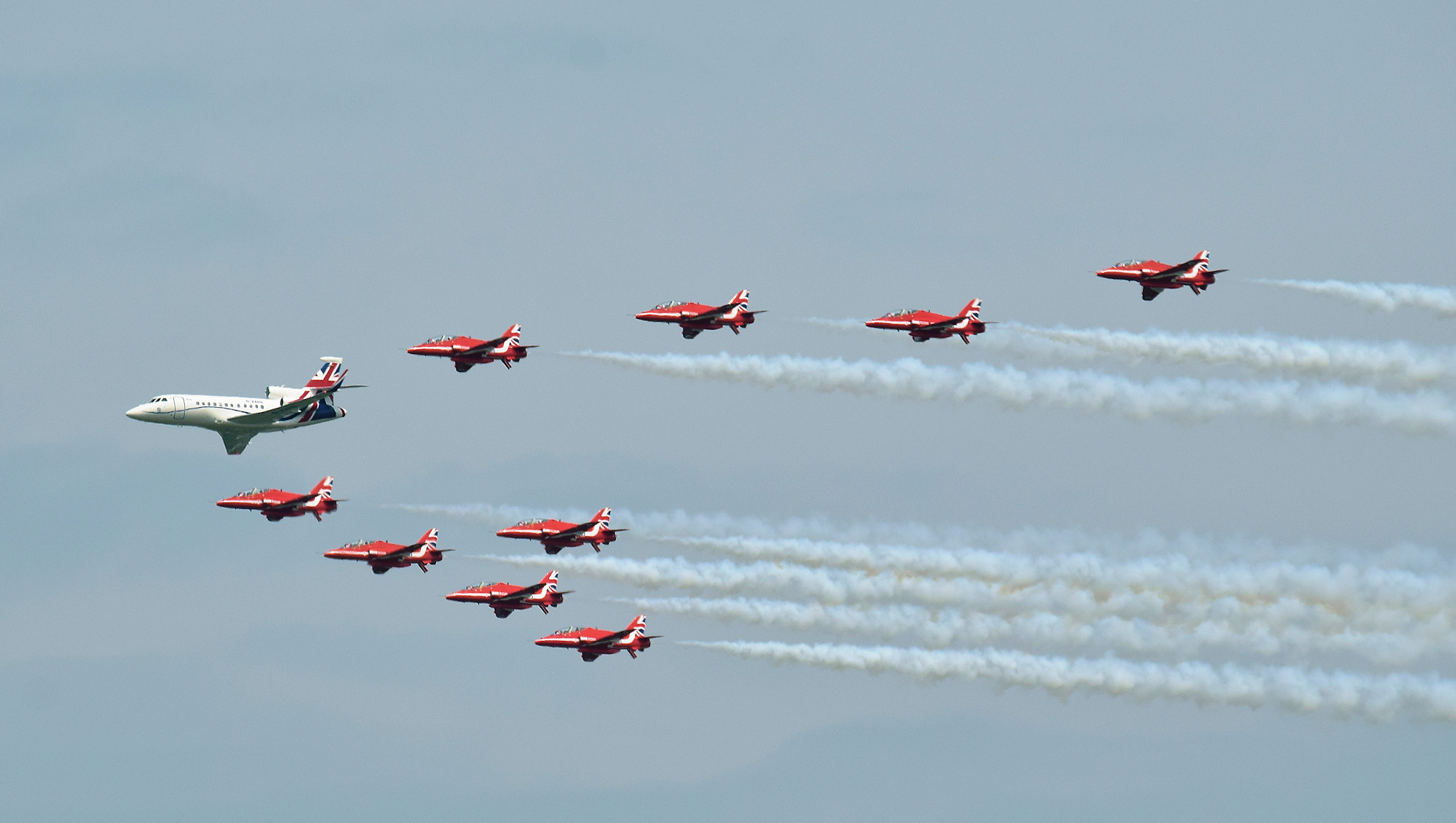 Alla fine sono arrivate anche le Red Arrows, la pattuglia acrobatica britannica, che accompagnava un aereo con cui non ho molta familiarità: sembra essere il Dassault Falcon 900 utilizzato dalla RAF per il trasporto dei VIP. Ironico, vedere un aereo francese al centro di un evento importante per la monarchia britannica. Ma dopotutto sono stranieri anche i Windsor: si tratta del Casato di Sassonia-Coburgo-Gotha, dopotutto.