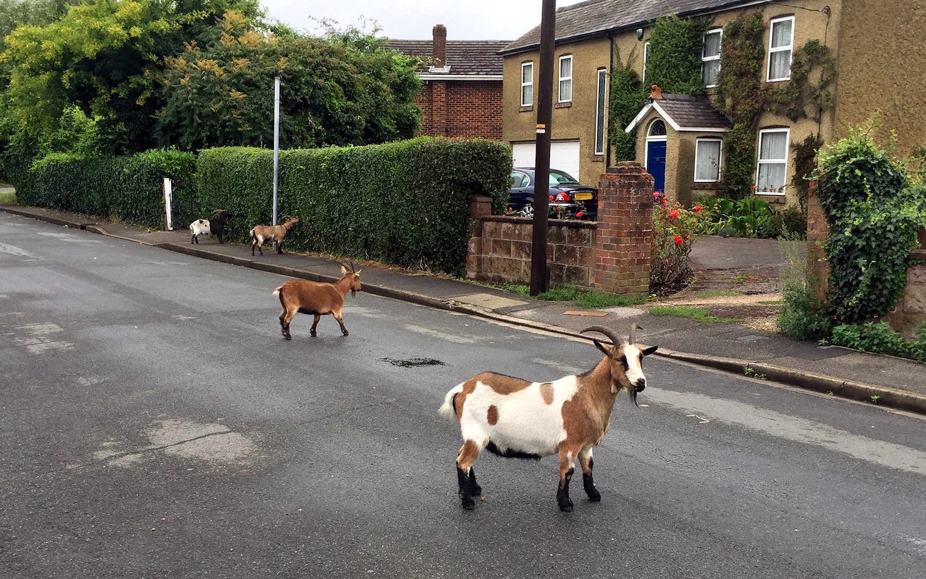 Le capre di Farm Way ogni tanto escono dal loro recinto e si avventurano su Hithermoor Road, la strada che gira intorno al centro abitato e ai suoi milletrecento abitanti. Queste capre amano molto le siepi dei miei vicini, che invece non gradiscono le loro visite, visti i danni che possono fare in pochi minuti alle suddette siepi. Ma c’è poco da fare: nonostante il mare di cemento a nord del villaggio (l'aeroporto di Heathrow col Terminal 5 e la South Runway), Stanwell Moor e' quasi un villaggio di campagna.