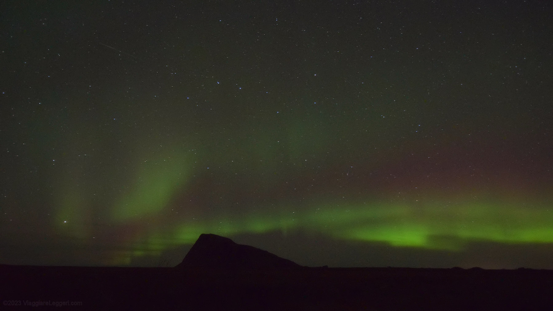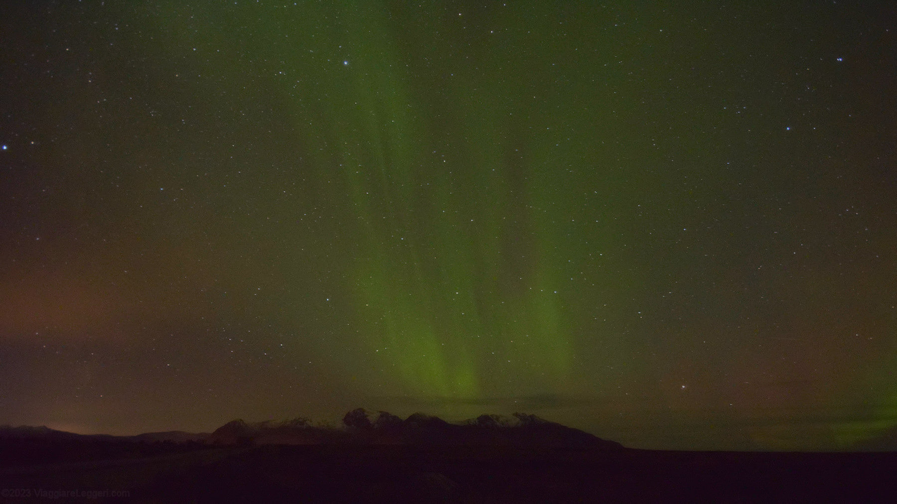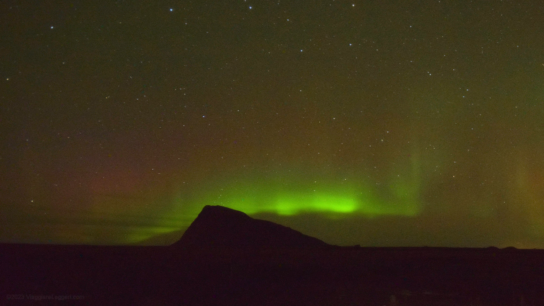 Arriviamo nel primo posto in cui cercheremo di fotografare l'aurora. Scendiamo, prepariamo cavalletti e macchine fotografiche. Mi stupisce vedere che solo Eric ed io abbiamo delle reflex. Come capita spesso, l'aurora boreale si intuisce appena, ad occhio nudo, ma basta farle una foto e diventa visibile.