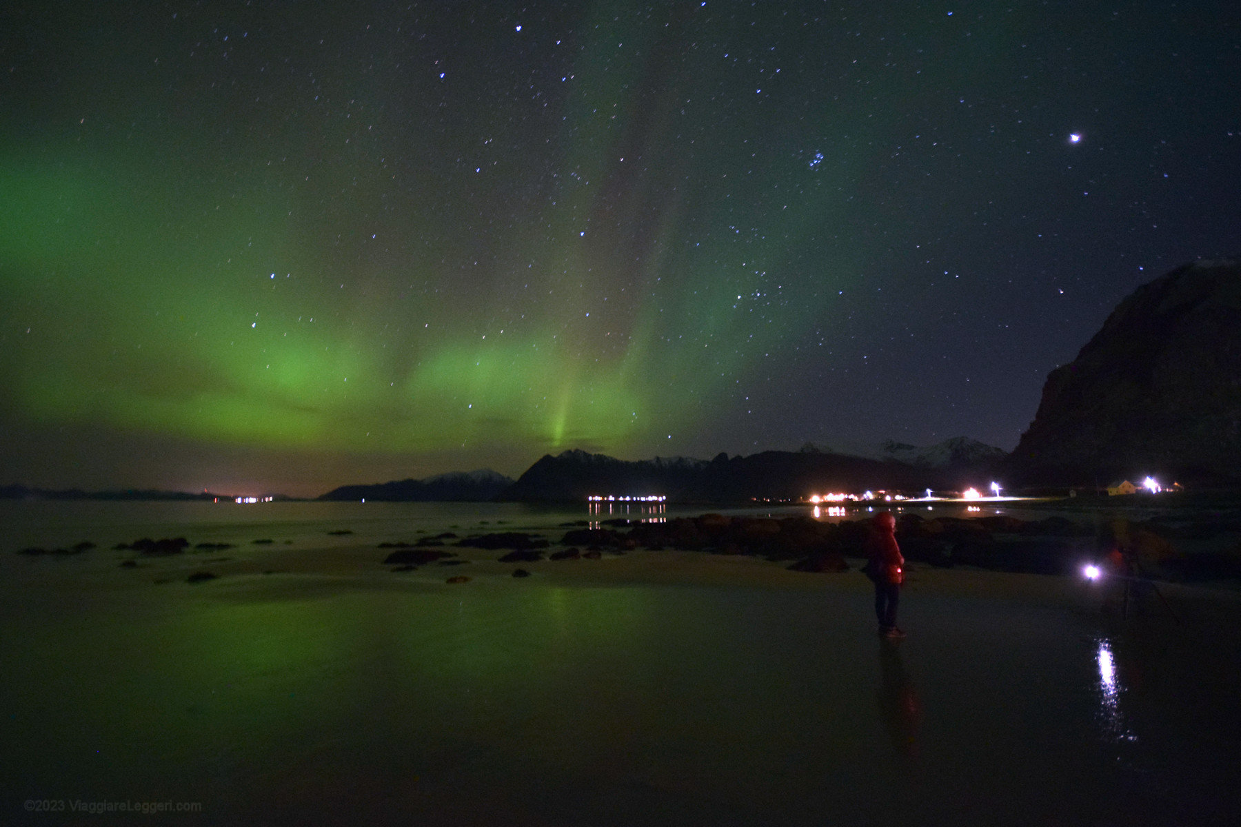 Arriva un Volkswagen Transporter con un'aurora boreale stampata sulle fiancate: è arrivato Eric, la nostra guida. Saliamo a bordo, noi quattro (mia moglie, mia cognata e suo figlio) e altre quattro persone. Partiamo, ed Eric inizia a raccontarci alcune cose. Primo, che andare "a caccia" dell'aurora boreale è un'espressione da marketing che non rispecchia la realtà di quest’attività: l'aurora la si aspetta, non la si cerca. Al massimo si cercano i posti migliori (per il panorama complessivo) per fotografare l'aurora.