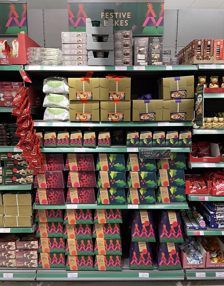 Ci sono poi i supermercati “normali”, quelli che avevamo elencato in "Appunti sui supermercati britannici". Abbiamo visitato Aldi, uno degli hard discount più economici, poi Waitrose e Marks & Spencer, che sono invece tra i più costosi. Da Aldi non ho visto panettoni. Mi dicono invece che da Lidl, perlomeno nel negozio a Chertsey, ce ne siano alcuni intorno alle cinque sterline; ripeto, non ci sono andato personalmente, e non so se siano fatti in Italia o meno.