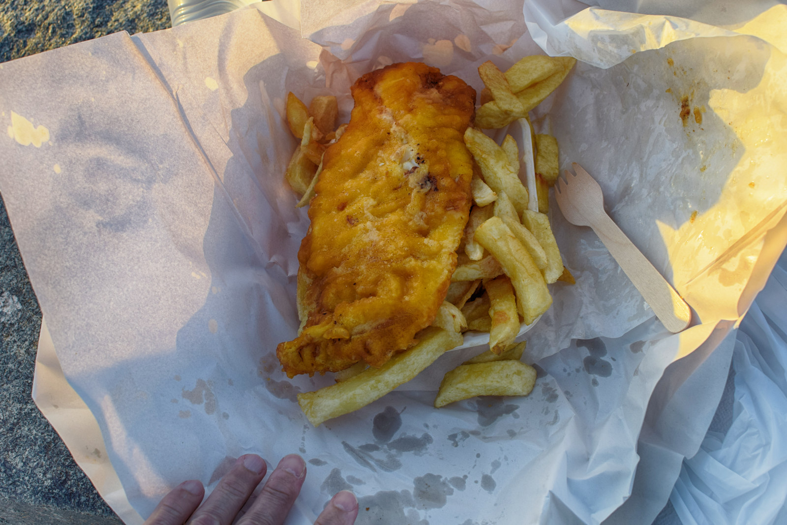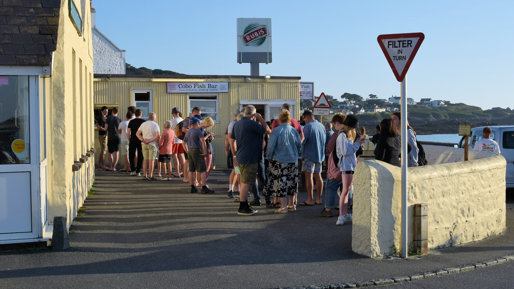 Durante il tramonto, siamo in coda al fish & chips più famoso di Cobo. C’è coda anche nei ristoranti, come scopriremo in questa settimana, ma questa e' stata la più lunga.