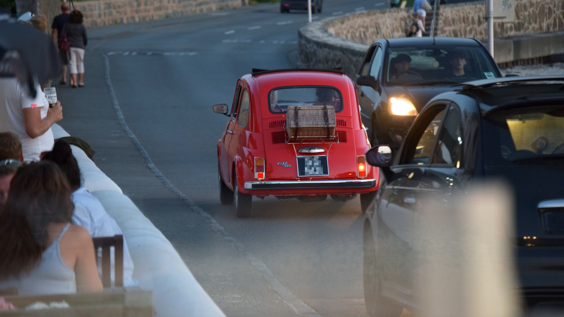 La strada che segue lungomare di Guernsey (ove possibile) e' lunga 63 km. A Cobo le auto si muovono lentamente, un po' per i bagnanti che attraversano la strada, un po' perché c’è un'atmosfera un po' californiana, molto rilassata. Direi che pare un'area per surfisti, se non fosse che non ci sono onde adatte; i falò e le feste in spiaggia, invece, ci sono ogni sera. E questa vecchia Cinquecento l'abbiamo vista più di una volta, dai tavoli dei ristoranti sul lungomare.