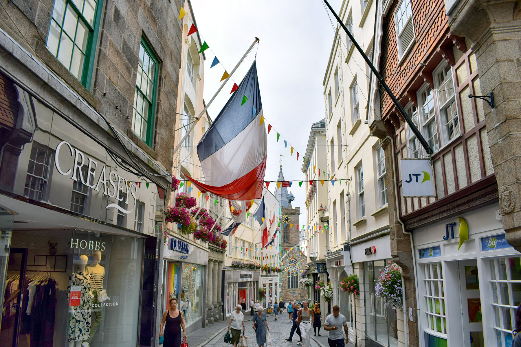 Il centro di St Peter Port. Non troverete bandiere straniere nella via principale di una qualsiasi città britannica (o italiana), di solito.