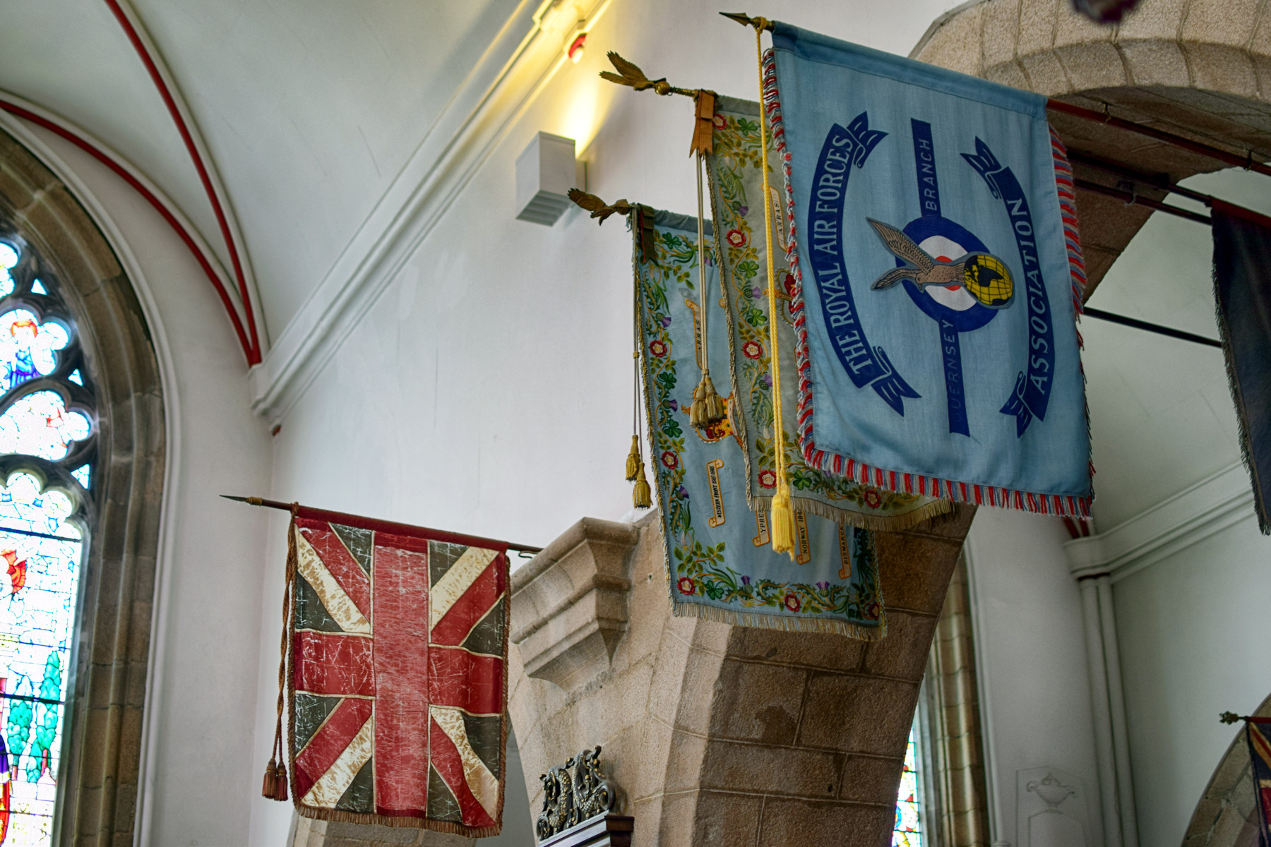 Una chiesa anglicana. Stendardi di associazioni di veterani militari.