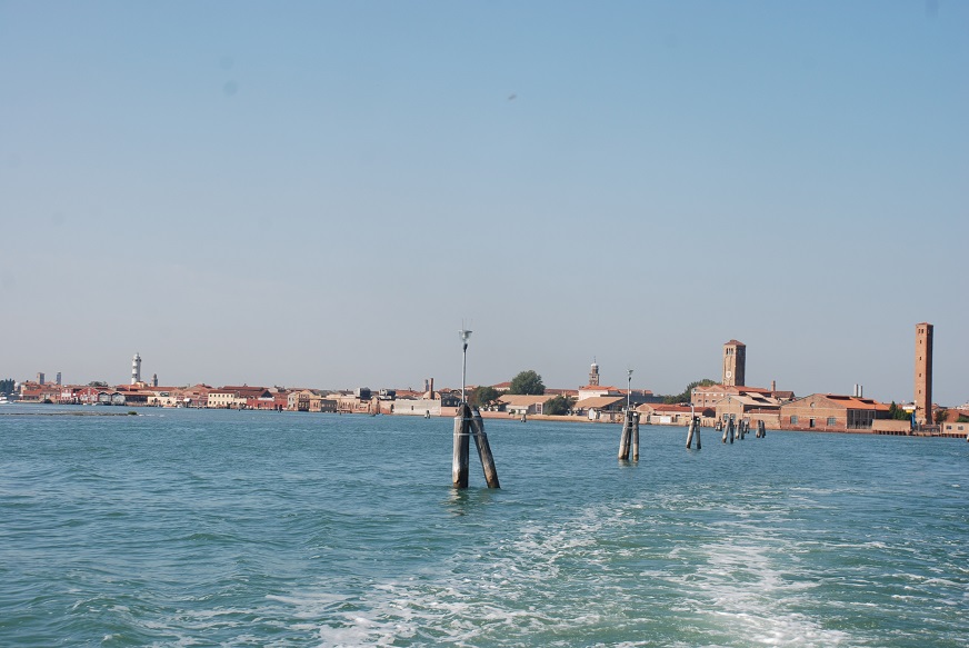 riprendiamo il vaporetto della linea 12, per fortuna questa volta non è affollato e ci accaparriamo un posto a poppa, con possibilità di fotografare la laguna e la skyline delle isole.