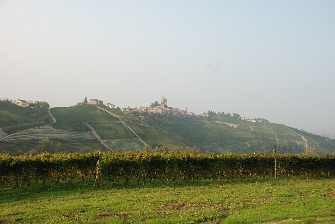 vigneti dopo la vendemmia; sullo sfondo, castello di Serralunga