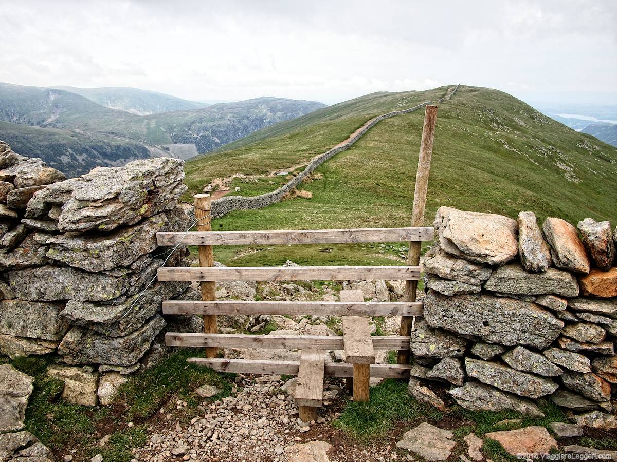 12,20: Hole In The Wall, finalmente! A 694 metri di quota, pare un buco in uno degli infiniti muri di pietra a secco che incorniciano le colline del Lake District, ma e' uno stile, un cancello a scaletta, fatto per consentire il passaggio ai bipedi umani ma non al bestiame (la foto e' stata scattata dopo averlo oltrepassato, guardando verso Birkhouse Moor). Per arrivare qui ho impiegato un'ora e venticinque minuti, e ora sono cotto: stanchezza nelle gambe, nelle spalle e nella schiena. Mi fermo venti minuti, forse mezz'ora; mangio il sandwich, bevo un po' d'acqua (il cappuccino e' ancora rovente, e alla fine rimarra' caldo per oltre 40 ore), scatto foto. Una dozzina di persone in varie comitive, la coppia di arzilli sessantenni e' pronta a ripartire, non so da dove siano arrivati qui gli altri, non li ho visti lungo il mio percorso. Forse stanno scendendo, non salendo...