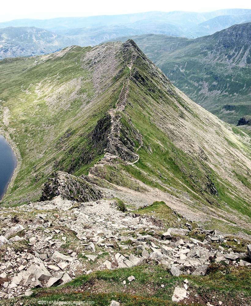 Vista complessiva di Striding Edge. Non male, per una collina (l'altezza ufficiale di Striding Edge e' 863 metri). Sono salito piu' in alto, in passato (tremila metri), ho fatto escursioni piu' rischiose, ma i panorami visti in quest'occasione, le sensazioni provate camminando sulla cresta, mi hanno rimesso in moto qualcosa, dentro. Voglio tornare "su". Il prima possibile. Piu' spesso possibile. Non mi interessano sport estremi, non cerco litri di adrenalina: mi basta essere con le montagne.
