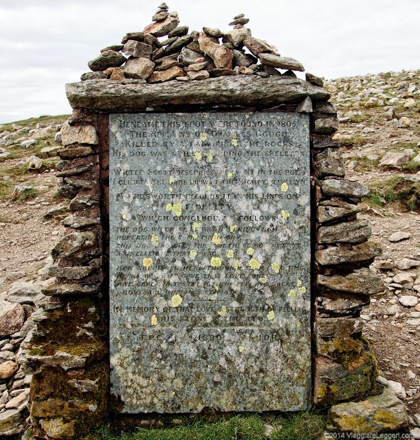 Dopo Striding Edge e poco prima di Helvellyn, il Gough Memorial. Charles Gough (1784 – 1805) era un esponente del Romanticismo inglese, e scomparve nell'aprile del 1805 durante un'escursione verso Helvellyn con il suo cane, Foxie. Tre mesi piu' tardi, un pastore, sentendo abbaiare vicino a Red Tarn, trovo' Foxie viva vicino al corpo del suo padrone, ormai ridotto ad uno scheletro. Gough probabilmente cadde da Striding Edge, e il suo carattere avventuroso, insieme alla fedelta' di Foxie (che durante la lunga veglia diede alla luce un cucciolo, morto poco dopo), ne fecero un simbolo del Romanticismo, e diedero spunto alle opere di vari artisti, tra cui Attachment, un dipinto di Francis Danby e Edwin Landseer, Helvellyn, un poema di Walter Scott, e Fidelity, un poema di William Wordsworth.