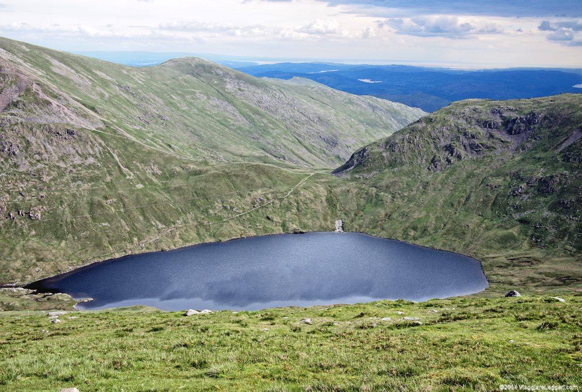 Grisedale Tarn. Si scende fino al livello del lago, poi lo si aggira da sinistra, prendendo il sentiero che risale per passare nel varco al centro della foto. La discesa verso il lago (in realta' un tarn, ma rimando a Tipi di laghi del Lake District e Quanti sono i laghi del Lake District per informazioni piu' precise su numero e classificazione degli specchi d'acqua del Lake District) avviene su un gradoni in pietra, ma dal momento in cui raggiungerete il livello del lago vi bagnerete i piedi: risalendo dal lago verso Hause Gap troverete che il sentiero condivide il suo percorso con un ruscello. Passato Hause Gap, scendendo verso sud/sud-ovest con l'unico sentiero a disposizione, sarete piu' all'asciutto, ma ci saranno occasionali incroci tra sentiero e torrente (gia', l'acqua ora e' aumentata e scende con piu' impeto verso la valle).
